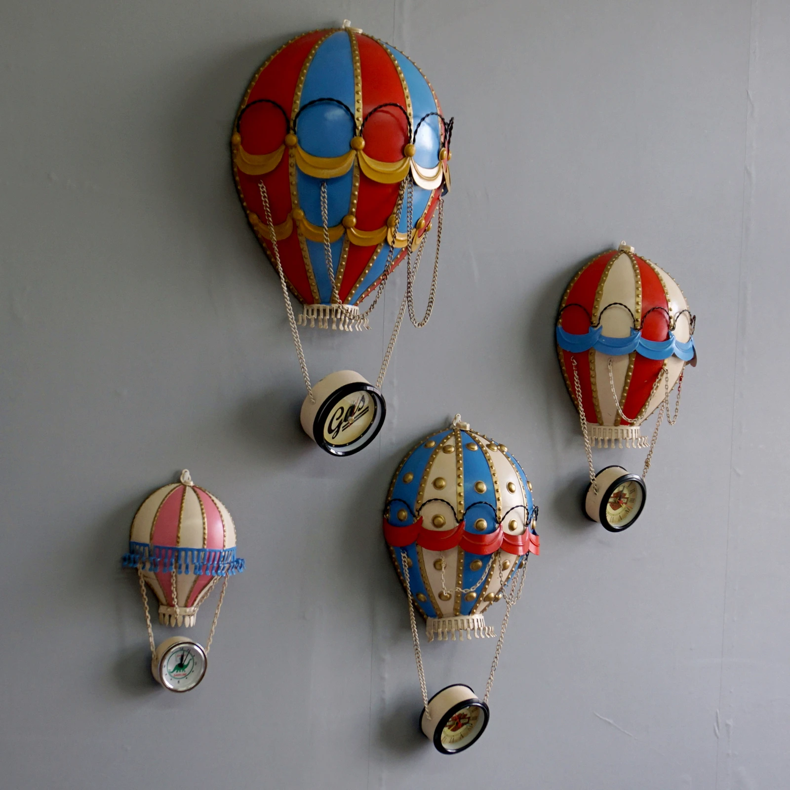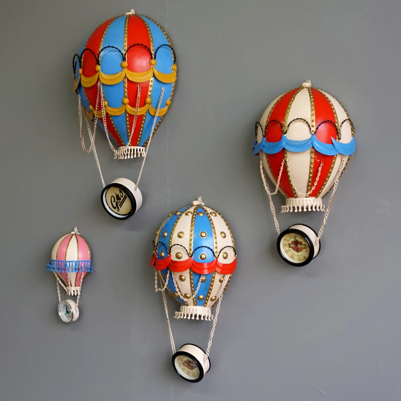 Retro Iron Antique Hot Air Balloon Wall Hanging With Clock Mural Decor Living Room Bedroom Wall Roo